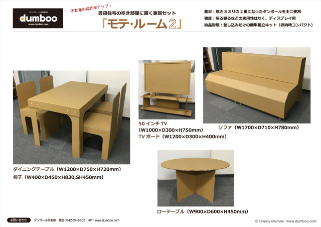 成約までの間、家具模型として空き部屋に置き、入居者様がお部屋の広さや間取りをイメージしやすくする、段ボール家具のセットです。